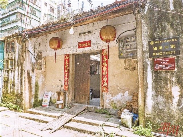 宅邸位于上東平路124號“仙田舊家”,占地面積1305.94平方米。穿過月門,可見石埕,在右側有一座北朝南的三進五間過之宅邸。心間前檐檐柱分上下兩層,下為石柱,上接木柱,石柱柱頭出丁頭栱,挑木柱所出的海棠屐,屐上置有牡丹楹枕承檁。上層檐柱與金柱之間,從下至上分別用牽(單步梁)和彎板連接。金柱為木質梭柱,柱頭作有八角櫨斗,櫨斗承楹(檁),大載插入金柱中。中跨作三載五三棱瓜抬梁載路,大載上三棱瓜穿插有彎板,與金柱柱頭八角櫨斗連接,中廳有槅扇窗。2011年公布為潮州市級文物保護單位。因產權復雜,住戶多搬離,年久失修,2024年7月5日20時許中廳倒塌。次日潮州相關部門即進行現場勘察,并向省上報及申請重修經費,現已進行搶修,有用的構件如三棱瓜、石柱礎等16件已送到湘橋區博物館存檔。