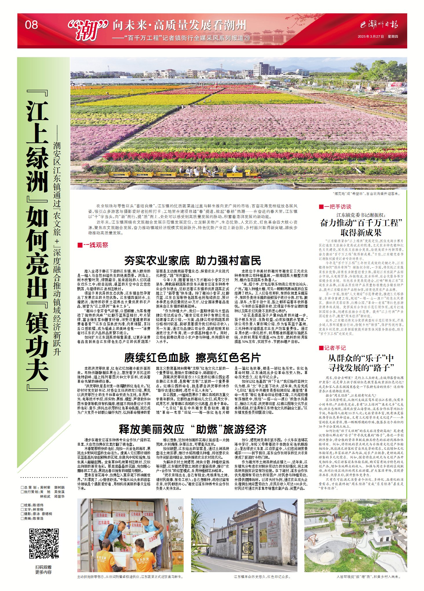 區位優勢明顯,從潮州主城區駕車前往江東鎮,僅需半小時車程;產業特色突出,素有“江上綠洲”“魚米之鄉”之美稱;新業態頻現,涌現出望山海營地、溪東合作社等網紅打卡地,年接待人數超10萬人次;文旅資源豐富,既有洪靈菲故居等紅色革命遺址,又有三元塔等歷史文化遺產……豐富的農文旅資源,像一顆顆璀璨的珍珠,散落在這個面積約38平方公里的土地上。