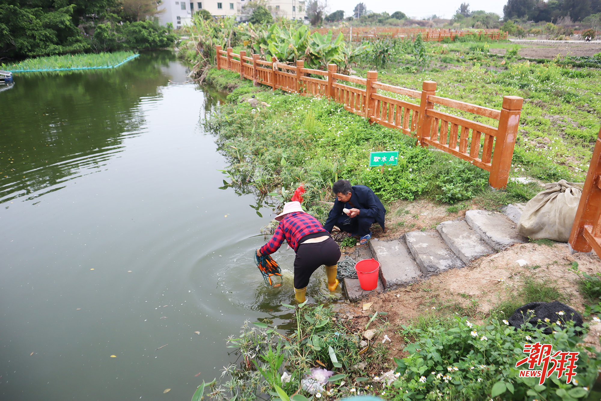 在饒平縣大埕鎮(zhèn)上東村,池塘水體清澈見底,成群的魚兒悠然游弋,成片的美人蕉在生態(tài)浮床上茁壯成長。幾位村民在生態(tài)塘邊的取水口汲水,準備用于農田灌溉和蔬菜地的澆灌。曾經泛著異味、漂浮雜質的污水,如今已蛻變?yōu)檫_到灌溉標準的活水。