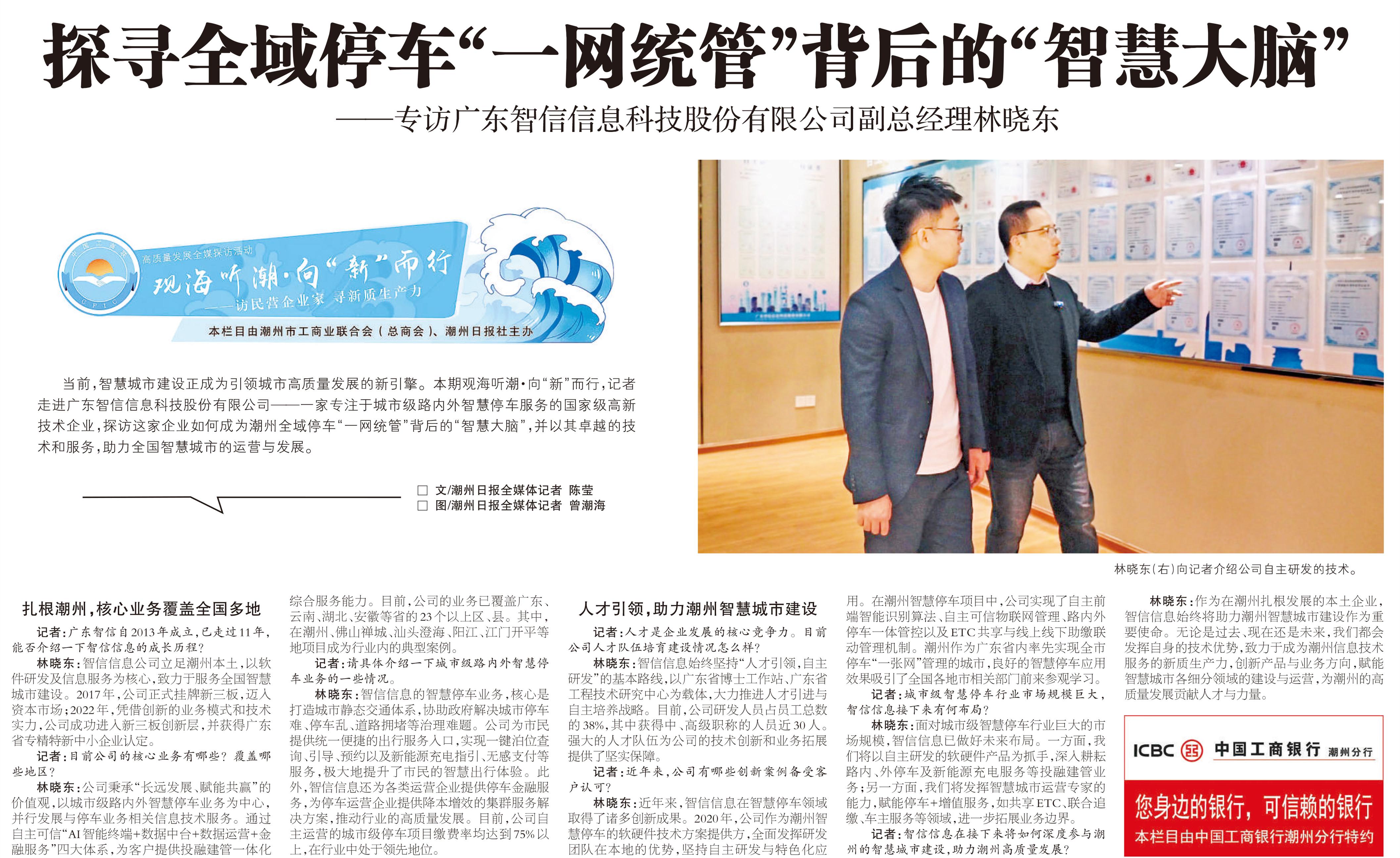 當前,智慧城市建設正成為引領城市高質量發展的新引擎。本期觀海聽潮·向“新”而行,記者走進廣東智信信息科技股份有限公司——一家專注于城市級路內外智慧停車服務的國家級高新技術企業,探訪這家企業如何成為潮州全域停車“一網統管”背后的“智慧大腦”,并以其卓越的技術和服務,助力全國智慧城市的運營與發展。