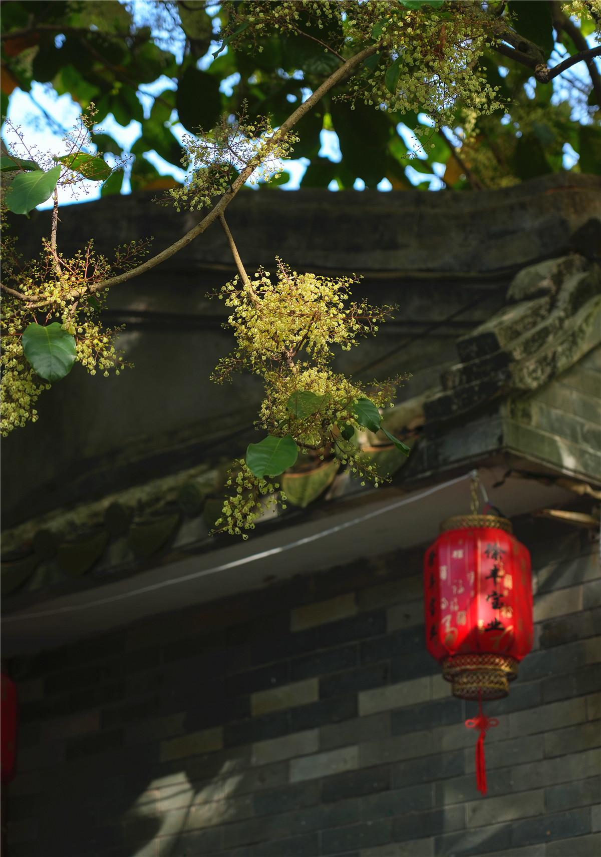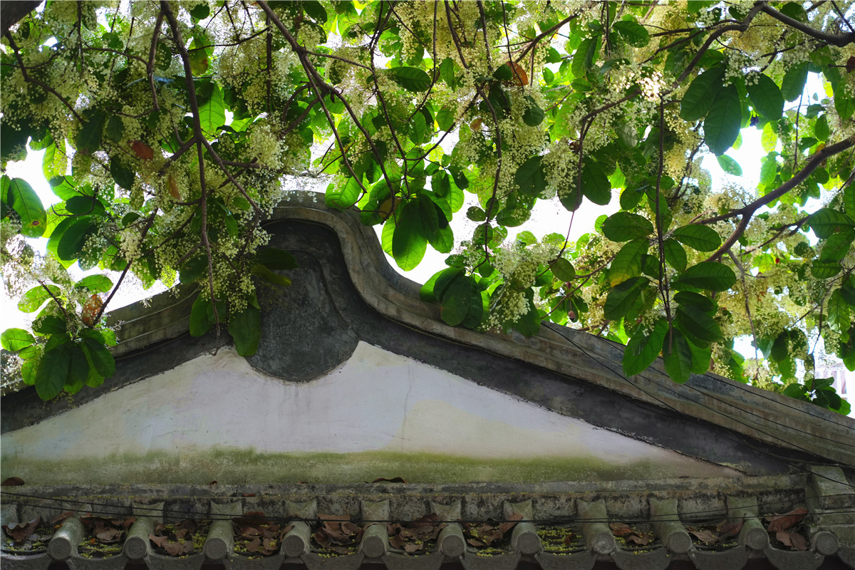 盛開在青苔斑駁的青磚黛瓦上的蘋婆花