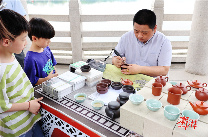 廣濟橋上的潮繡、潮彩繪畫、陶刻技藝等眾多非遺項目展演。潮州日報全媒體記者 陳宏文 攝