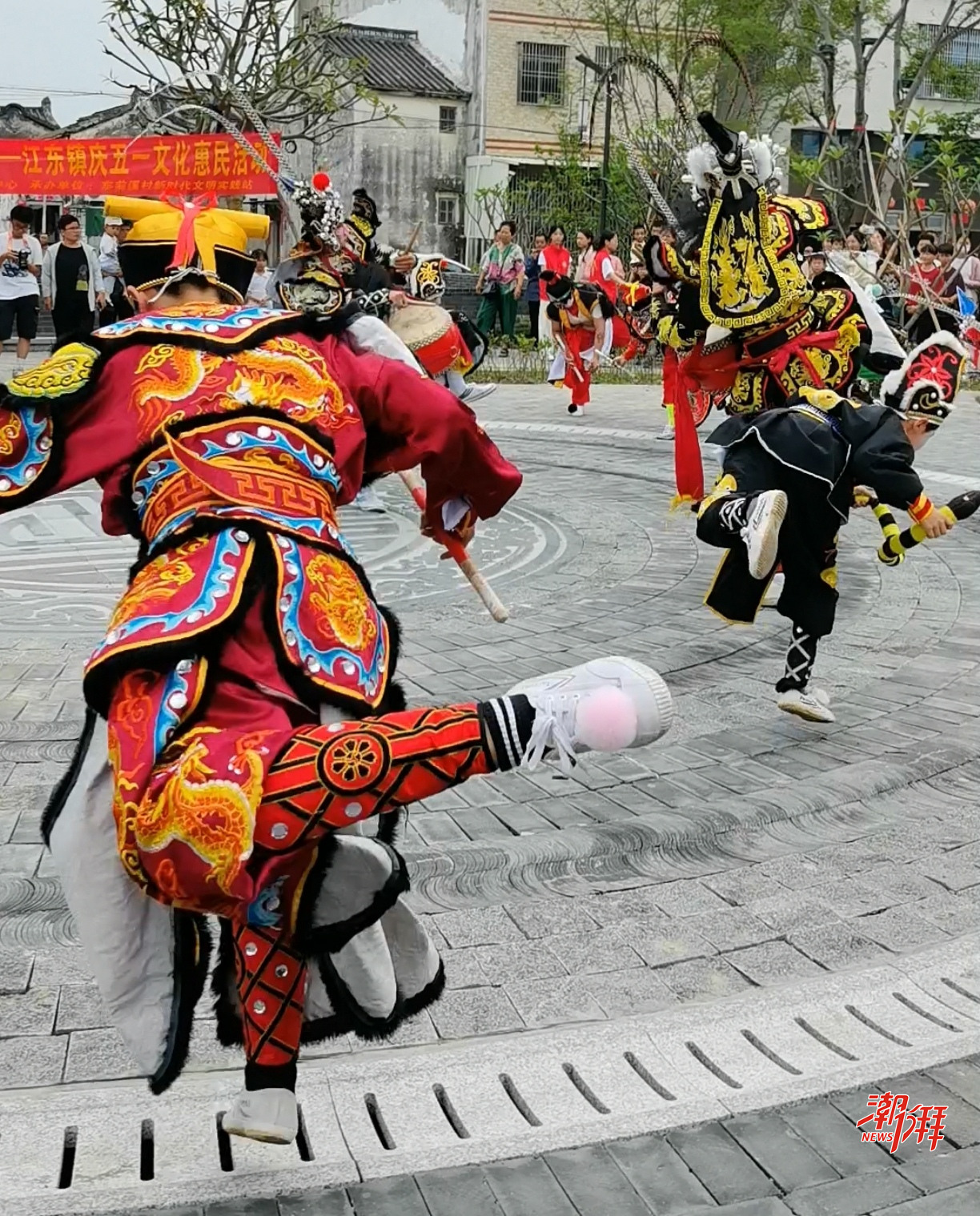 在潮安區江東鎮東前溪村老厝邊花園上,“英歌騰躍慶五一,典型名村綻風華”英歌舞文化活動火熱上演。(張澤慧 攝)