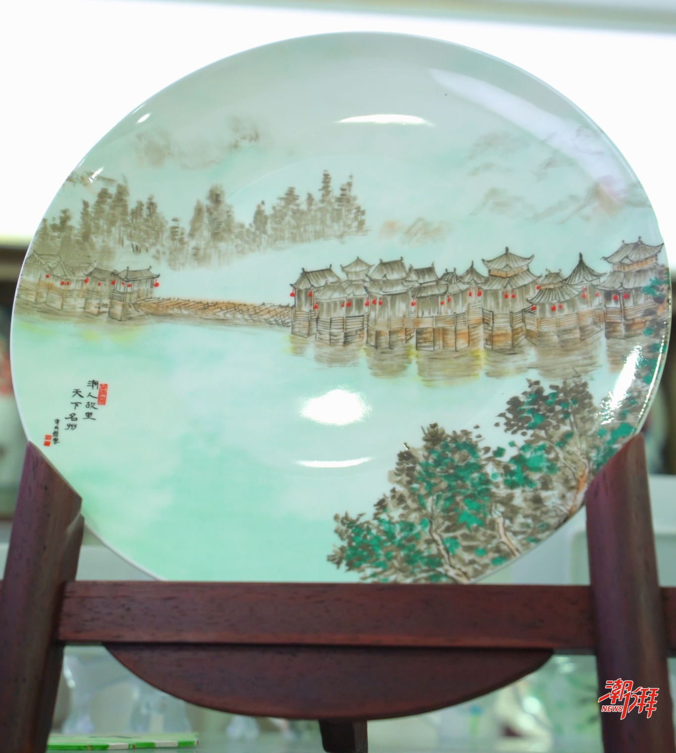 張熱云的傳承之路始于對傳統工藝的敬畏與堅守。潮州彩瓷從拉坯、勾線到填色、燒制,每一道工序都歷經千錘百煉。老藝人常言“一筆定乾坤”,勾線時以中鋒運筆如屋漏痕,線條粗細變化暗合呼吸節奏。在張熱云看來,潮州彩瓷的靈魂便是以工載道,以彩傳神,她指著彩瓷作品《廣濟橋》向記者介紹道:“這幅作品便是我將師爺李可染先生的繪畫技法融合到潮州彩瓷當中”。在不斷學習中,張熱云積極吸收山水畫的技法,與潮州彩瓷的燒制技藝有機結合,形成獨特的藝術風格,家鄉對她而言,是埋藏在筆墨深處的文化基因,更是藝術生命的永恒坐標。