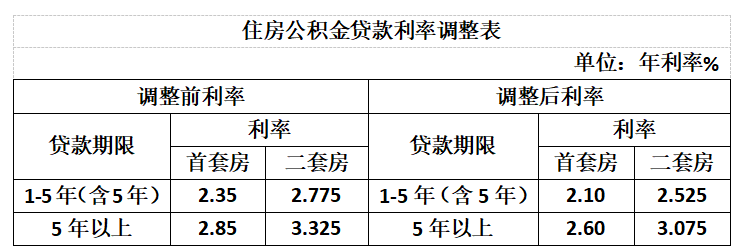 一、自2025年5月8日起,下調個人住房公積金貸款利率0.25個百分點,5年以下(含5年)和5年以上首套個人住房公積金貸款利率分別調整為2.1%和2.6%,5年以下(含5年)和5年以上第二套個人住房公積金貸款利率分別調整為不低于2.525%和3.075%。