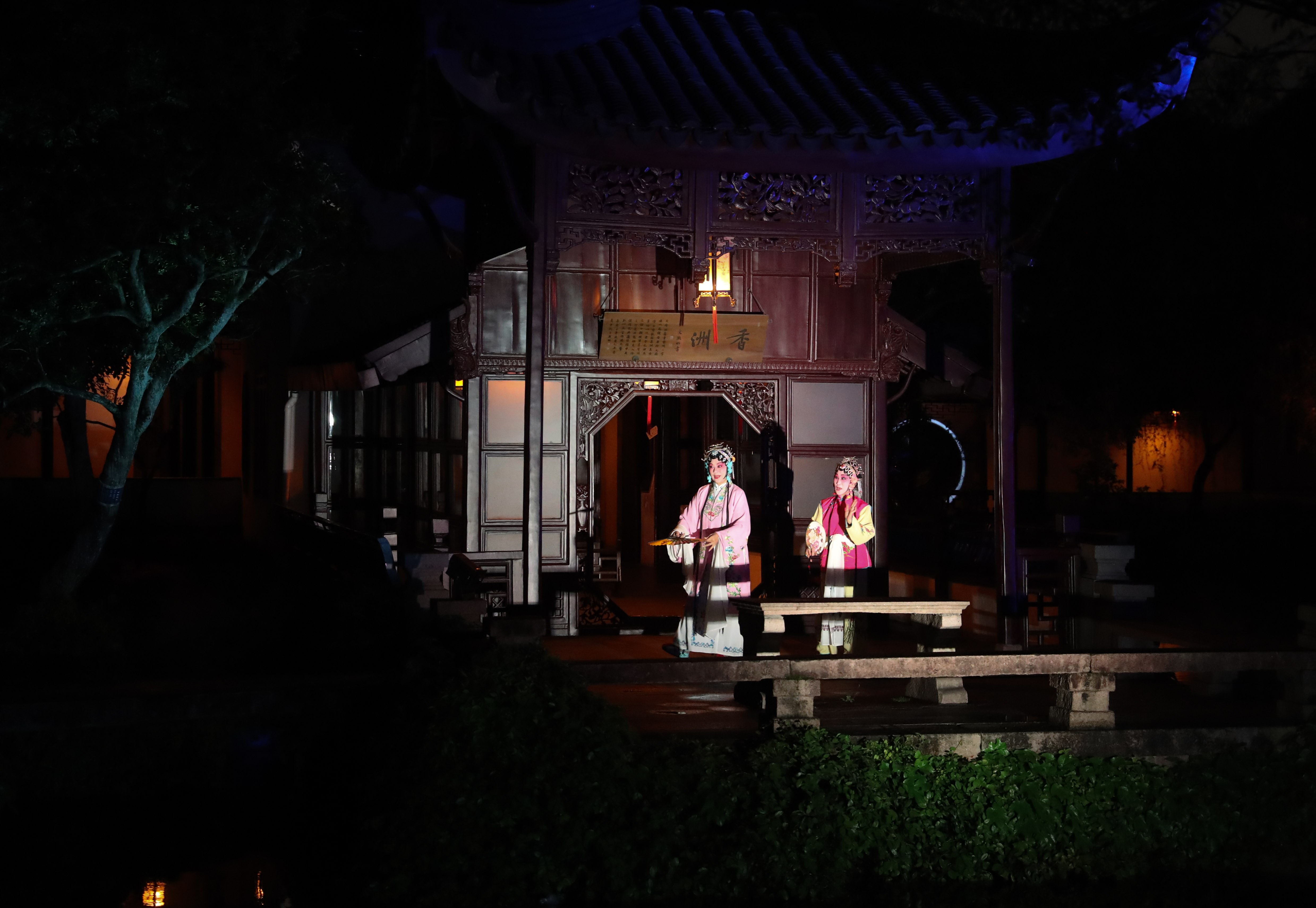 昆曲演員在蘇州古典園林拙政園“拙政問雅”夜游項目中實景演出。
