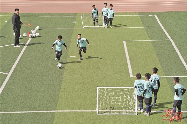 在西安市曲江第六小學(xué),足球隊(duì)員在體育課上進(jìn)行攻防練習(xí)。 新華社發(fā)