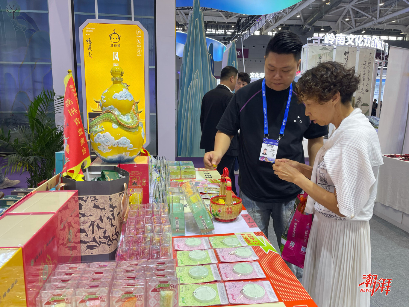 現(xiàn)場(chǎng),潮州王伉傳統(tǒng)文化研究會(huì)打造了“廣東省非物質(zhì)文化遺產(chǎn)保護(hù)項(xiàng)目——潮州青龍廟會(huì)”,以圖文并茂、實(shí)物陳列等方式,展現(xiàn)匯聚眾多非遺門(mén)類(lèi)的民俗活動(dòng)。參展商丁志勇介紹,此次帶來(lái)以青龍廟會(huì)為主題設(shè)計(jì)的品牌系列酒,以弘揚(yáng)非遺為核心,通過(guò)數(shù)字化手段將非遺與現(xiàn)代酒類(lèi)產(chǎn)品設(shè)計(jì)創(chuàng)新融合,打造出兼具文化傳承價(jià)值與商業(yè)屬性的主題商品。“10款產(chǎn)品分別代表潮州大鑼鼓、鯉魚(yú)舞、英歌舞等10項(xiàng)青龍廟會(huì)非遺表演。”丁志勇說(shuō),消費(fèi)者只需掃描瓶身二維碼,便能觀看對(duì)應(yīng)的非遺表演視頻,提升公眾對(duì)非遺的認(rèn)知與了解。