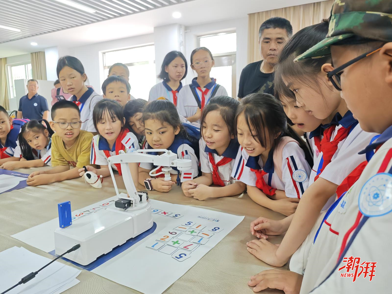 在志愿者的帶領下,同學們走進韓山師院,開啟了一場奇妙的“科學之旅”。在物理與電子工程學院的實驗室里,同學們近距離接觸了機器人、3D打印機、智慧工廠系統。“光亮程度可以控制飛機的速度”“可以人造龍卷風”“機器人也會垃圾分類”……神奇的物理實驗深深吸引了同學們的目光。在天文館,通過天文科普望遠鏡,同學們穿透云層,觀測日月盈虧、追逐行星軌跡,將浩瀚宇宙、璀璨星辰盡收眼底。