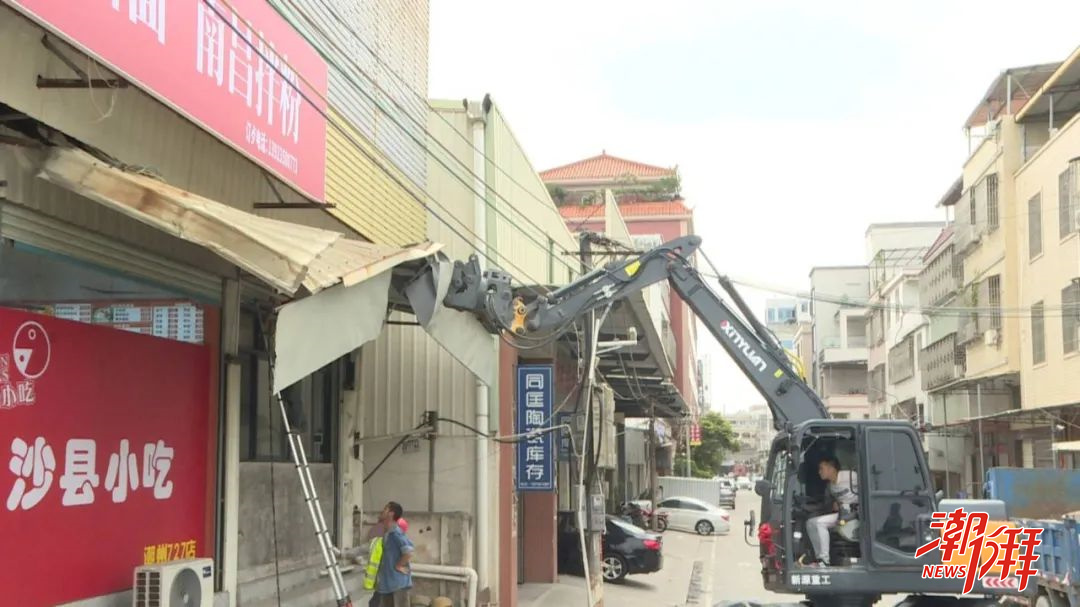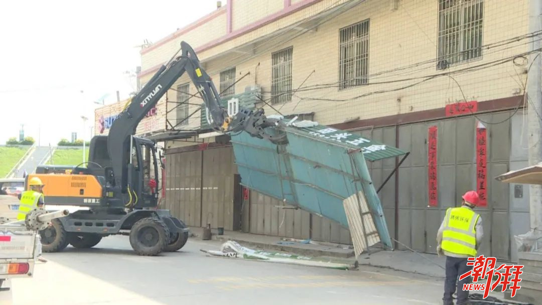 在護(hù)堤路云步村段拆違現(xiàn)場,工作人員在維護(hù)現(xiàn)場秩序、確保安全的情況下,利用專業(yè)機(jī)械設(shè)備對違規(guī)的鐵皮屋、店招及各類拉掛橫幅進(jìn)行拆除,促進(jìn)主干道市容市貌提升。
