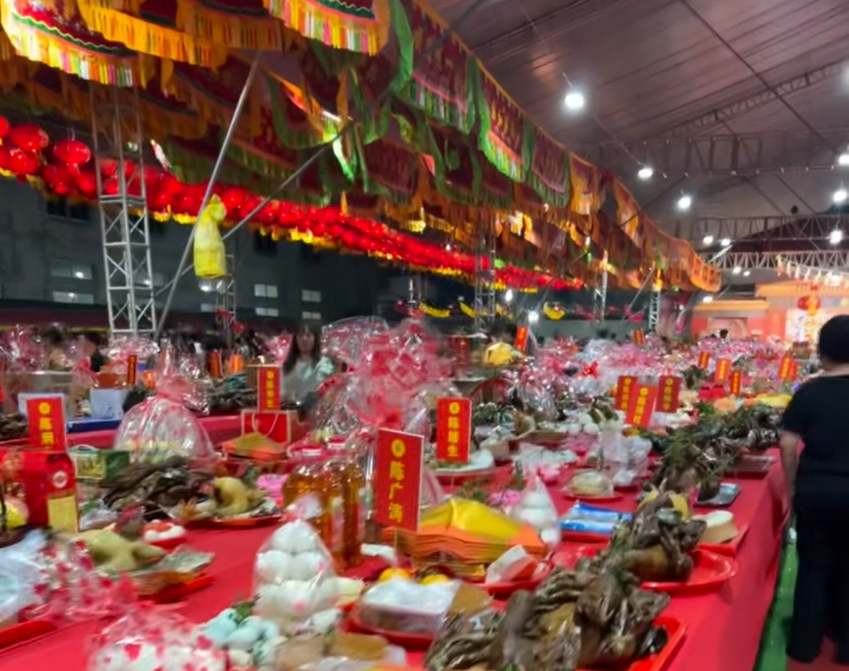 早在正月十六的白天,王厝隴村便在“營老爺”。村中青壯年男性抬著三山國王、夫人及福德老爺圣駕巡游于村里的每一條大路、每一條小巷。所到之處,鞭炮噼啪作響,煙塵彌漫里洋溢的是村民喜悅的笑臉;所過之處,鮮艷紙屑鋪滿一地,那是新的一年通往幸福生活的康莊大道。明月高懸時,煙花秀接連上演。人們仰望空中一束束綻開的“花朵”,不住發(fā)出驚嘆聲,眼睛都不舍得眨一下,生怕錯過最美麗的那朵。一旁池塘的水面上映出“百花齊放”的倒影,比高處真實的煙花還要璀璨。打在祠堂屋頂上、榕樹上那些,一瞬間照亮烏黑的瓦片和墨綠的樹葉,好像給它們鍍上一層華彩的金子。