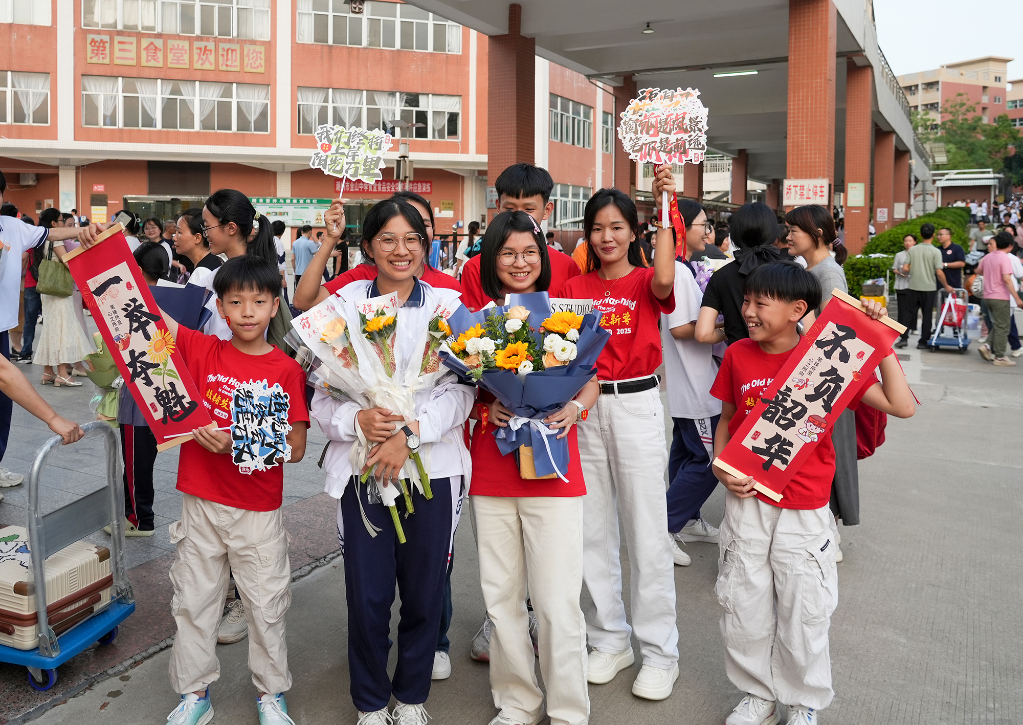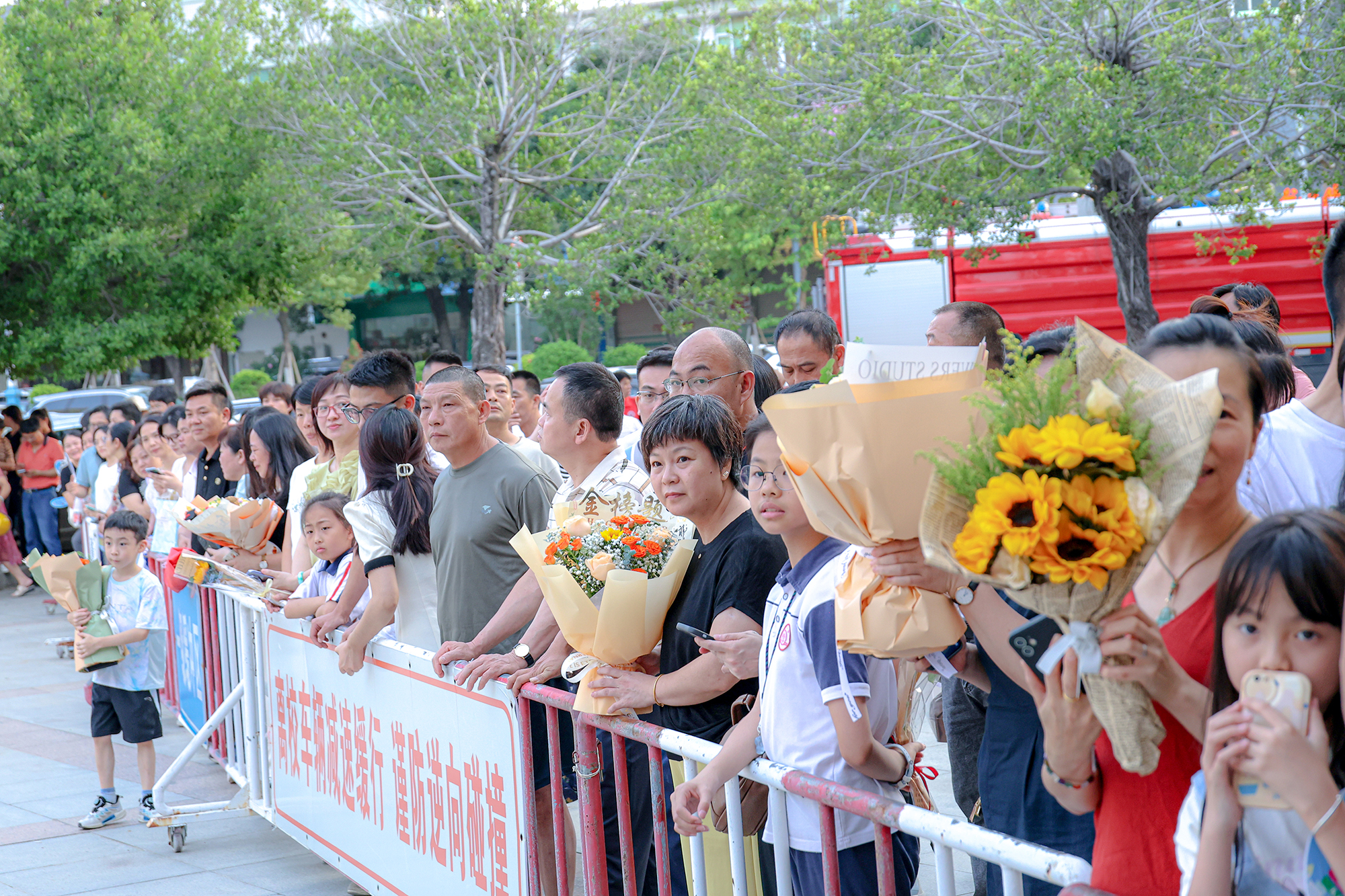 眾多家長(zhǎng)與親友手捧芬芳的鮮花