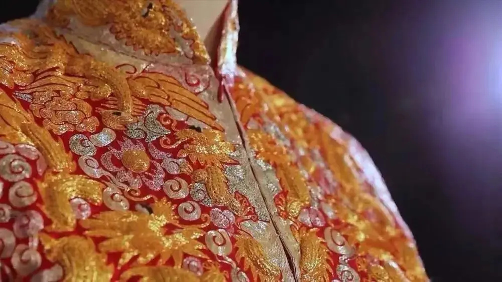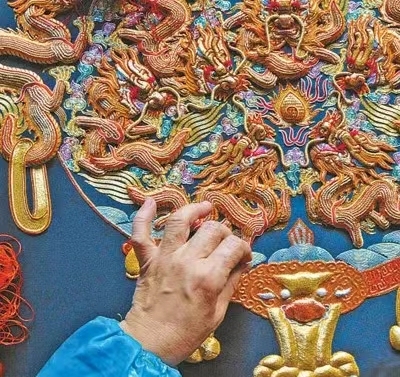 潮州牌坊街上,國家級非遺代表性項目粵繡(潮繡)代表性傳承人康惠芳的工作室里,金碧輝煌的龍鳳褂吸引著游客的目光。工作室珍藏著康惠芳50多年前繡制的一件嫁衣——紅緞上浮雕般凸現32條龍、32只鳳,云彩花卉密密麻麻繡滿,美不勝收。