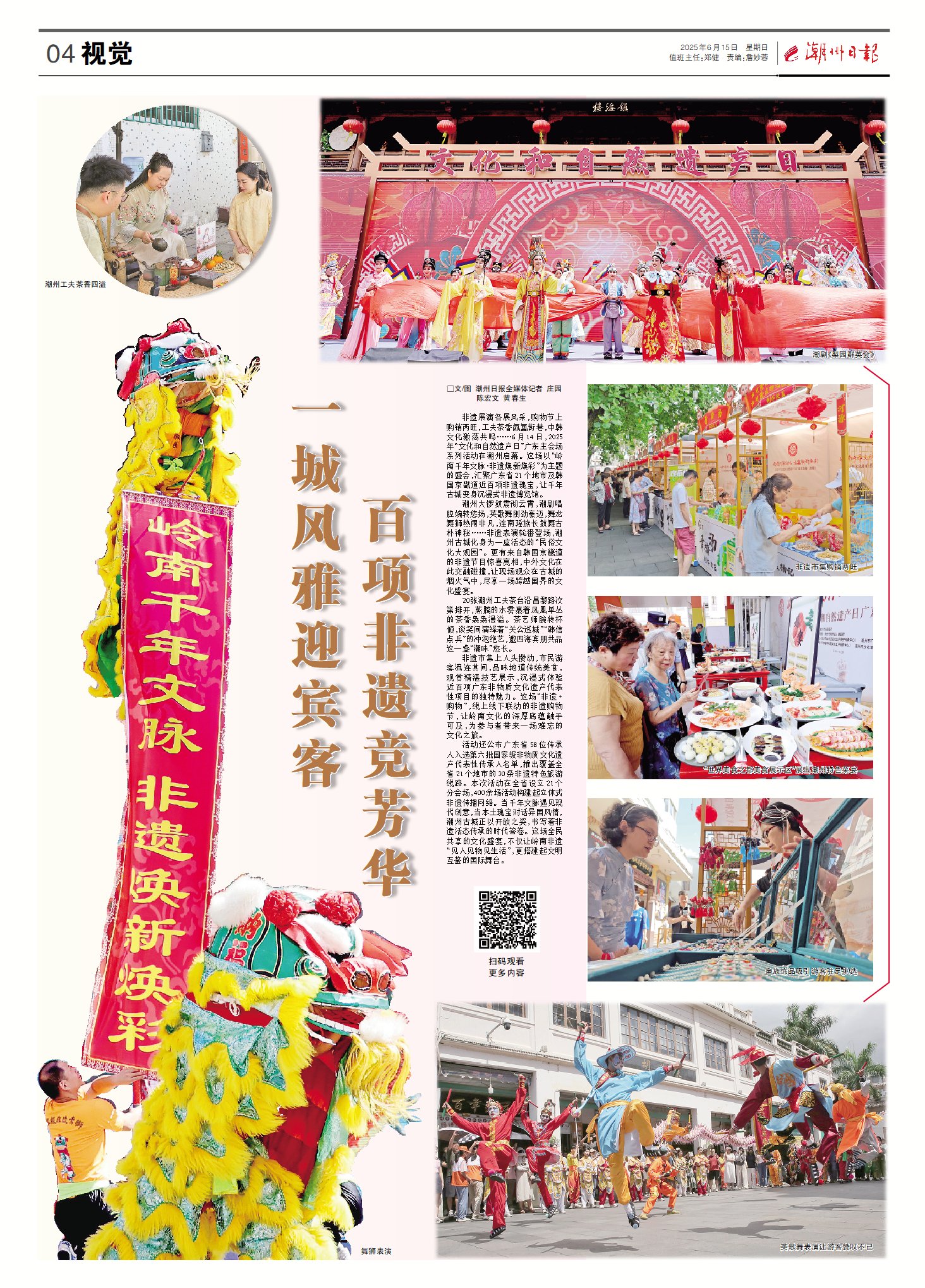 6月14日,2025年“文化和自然遺產(chǎn)日”廣東主會(huì)場(chǎng)系列活動(dòng)在潮州啟幕。這場(chǎng)以“嶺南千年文脈·非遺煥新煥彩”為主題的盛會(huì),匯聚廣東省21個(gè)地市及韓國(guó)京畿道近百項(xiàng)非遺瑰寶,讓千年古城變身沉浸式非遺博覽館。