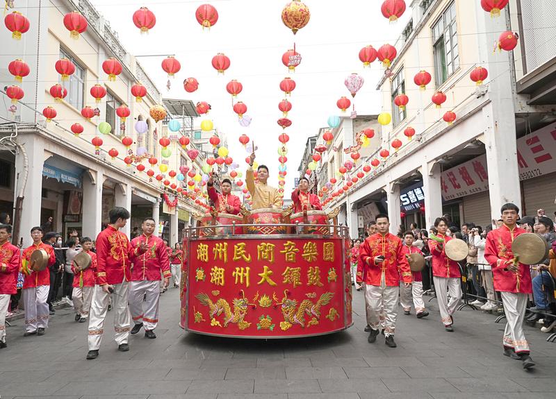 潮州大鑼鼓演奏時既有千軍萬馬般的氣勢磅礴,又能如三月春光般的細膩高雅,可謂音色雄渾與柔美并存。文以載道,且歌且行。韓愈任潮州刺史時,在《潮州祭神文五首》中就曾寫過“吹擊管鼓,侑香潔之”“侑以音聲,以謝神貺”等記錄有關潮州音樂的文字。這唐人雄樂發展到今天,隨著近代一艘艘紅頭船“過番”闖蕩,也將大鑼鼓傳播至世界各地,成為海外潮人文化認同的重要符號。今年央視春晚,潮州大鑼鼓和英歌舞、潮繡等極具嶺南特色的非遺代表性項目同臺亮相,一時引起國人轟動,成為文化熱點。鑼鼓越千年,鏗鏘新時代,一通通鑼鼓正在綻放新的文化光彩。