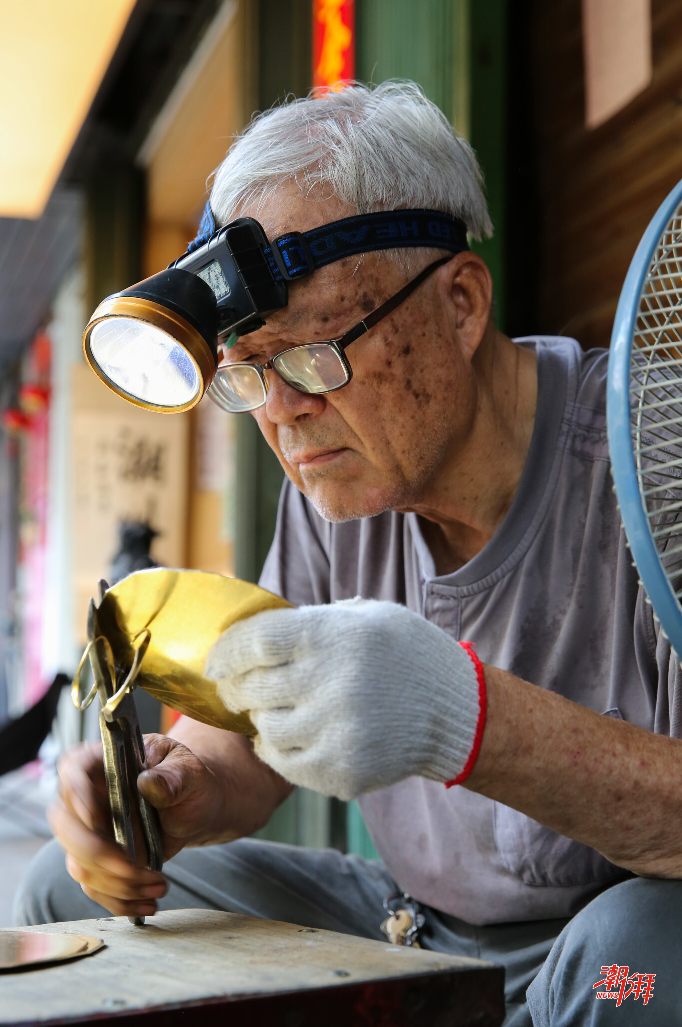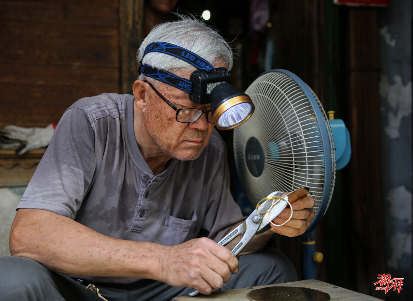 “池伯,吃了沒?”“吃好哇!來開始!”這是義安路上鮮活又日常的對話,池遠賜坐在木凳上,手握錘子,俯身開始敲打一塊赤銅。在他身后,墻上那臺上世紀80年代的掛鐘穩(wěn)健前行,那扇同樣布滿歲月痕跡的吊頂風扇咿呀作響。