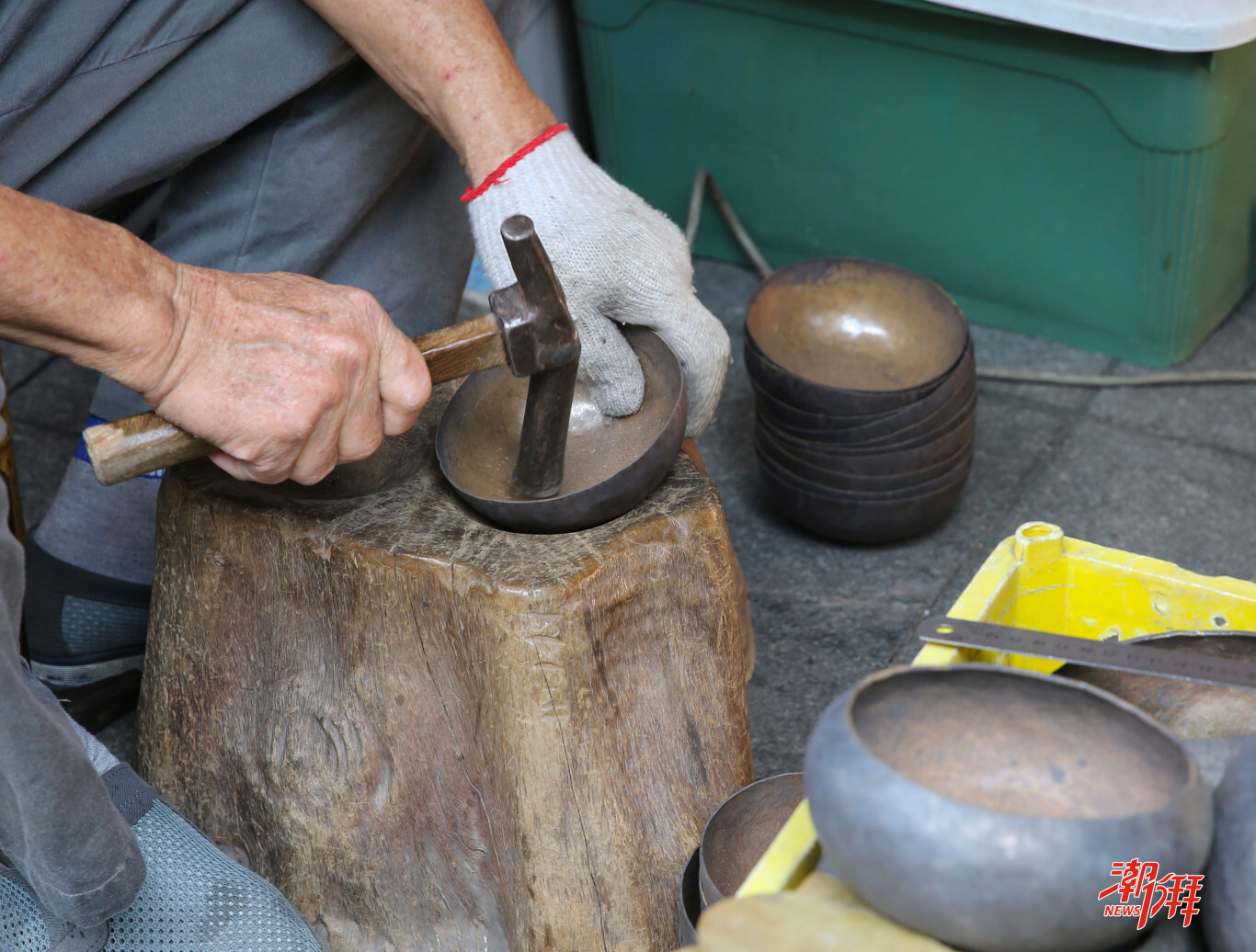 當?shù)谝豢|清脆的敲擊聲,從9平方米的店鋪響起,義安路似乎才真正蘇醒了——然而這聲音,卻是潮州古城里目前僅有的打銅聲。