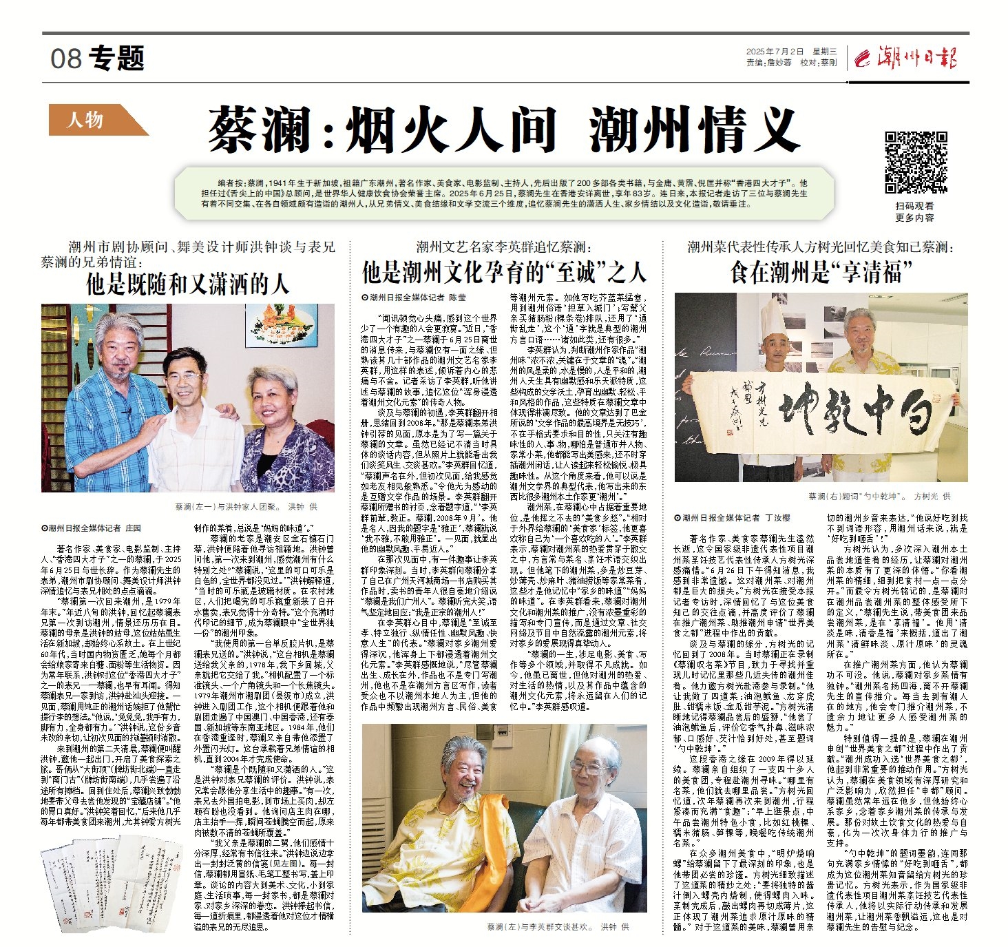 編者按:蔡瀾,1941年生于新加坡,祖籍廣東潮州,著名作家、美食家、電影監制、主持人,先后出版了200多部各類書籍,與金庸、黃霑、倪匡并稱“香港四大才子”。他擔任過《舌尖上的中國》總顧問,是世界華人健康飲食協會榮譽主席。2025年6月25日,蔡瀾先生在香港安詳離世,享年83歲。連日來,本報記者走訪了三位與蔡瀾先生有著不同交集、在各自領域頗有造詣的潮州人,從兄弟情義、美食結緣和文學交流三個維度,追憶蔡瀾先生的瀟灑人生、家鄉情結以及文化造詣,敬請垂注。