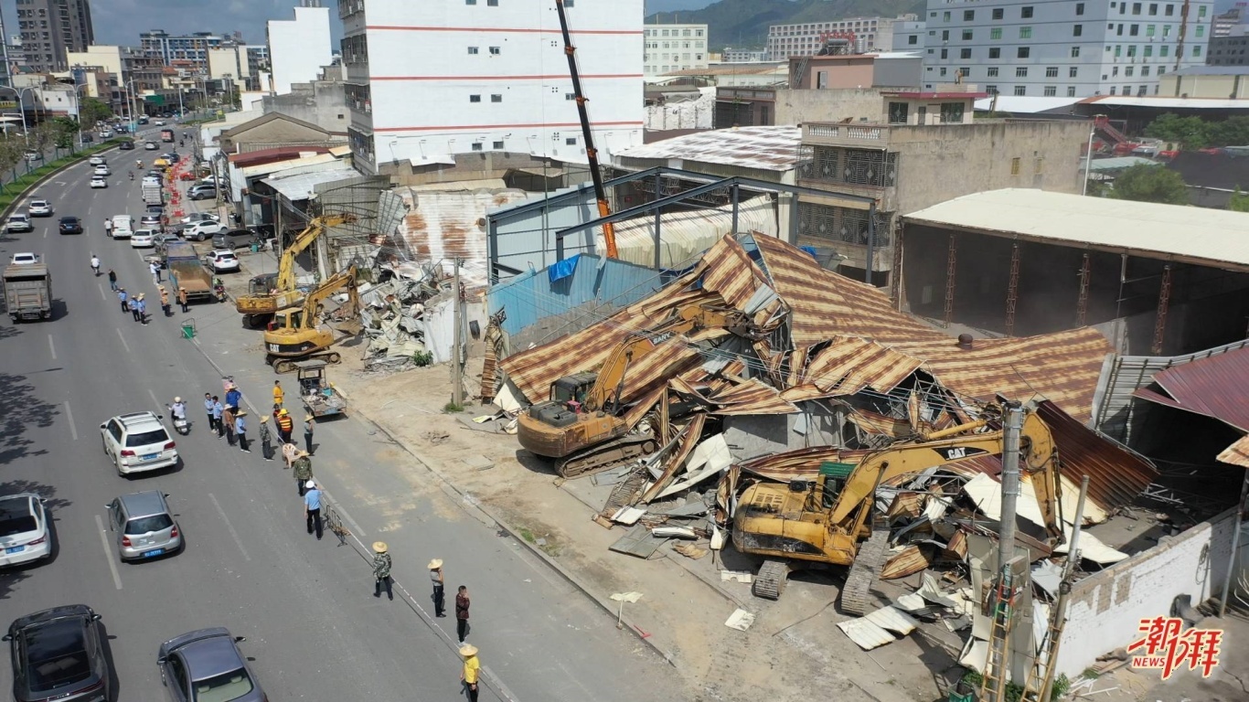 行動當天,在新風路鳳塘鎮東門村段,多臺大型挖掘機協同作業,連片的鐵皮構筑物應聲倒下,施工人員隨即對建筑廢料進行清運搬離。