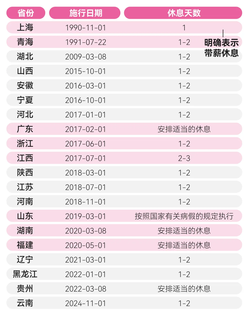 記者了解到,據不完全統計,目前,全國已有包括北京、上海、廣東、浙江、云南等約20個省市,在地方性規定中明確了女性勞動者的這一權益,休息時間普遍在1~2天,最多的是3天。