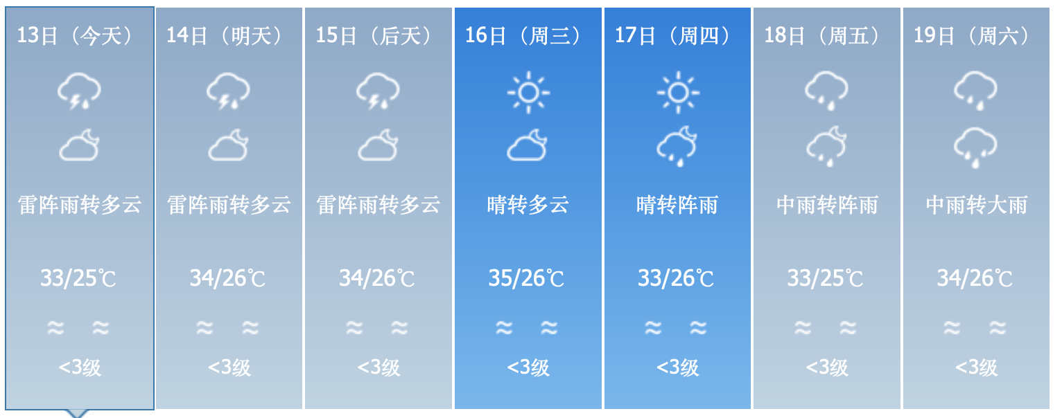13日,粵北、珠江三角洲西部及南部沿海、粵西市縣多云,有分散(雷)陣雨局部大雨或暴雨,其余市縣多云間晴天,局部有(雷)陣雨。最高氣溫:南部沿海市縣29℃~32℃,其余市縣32℃~35℃。