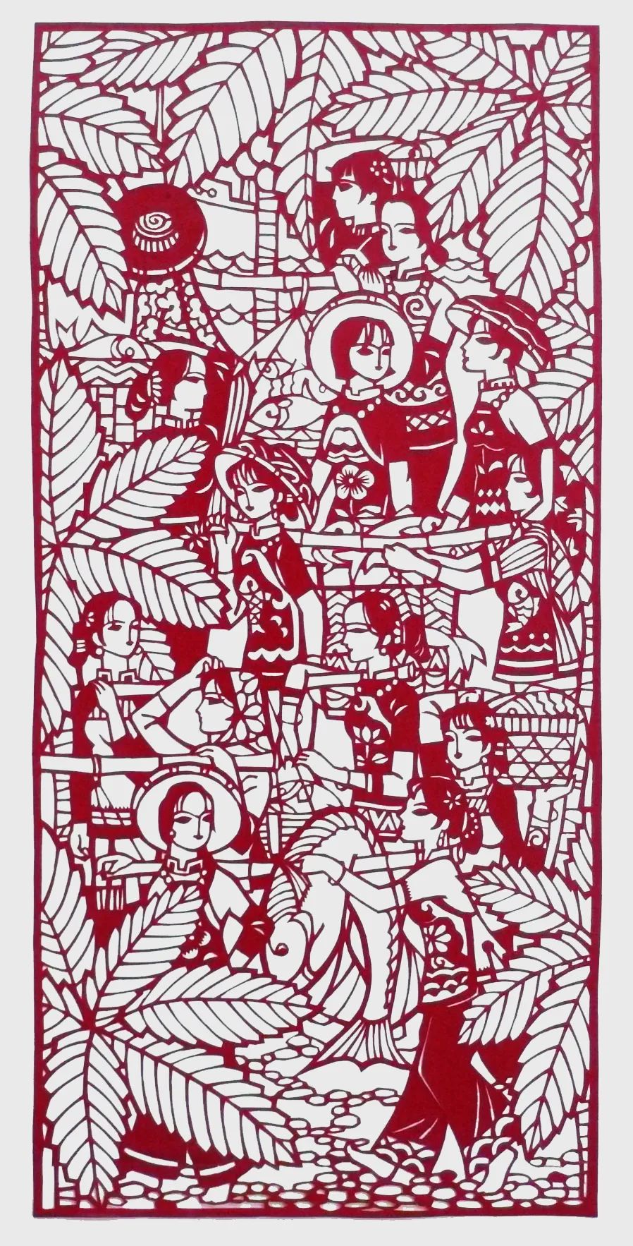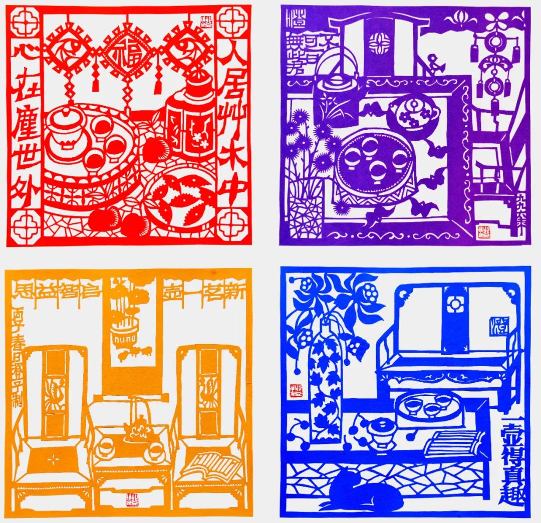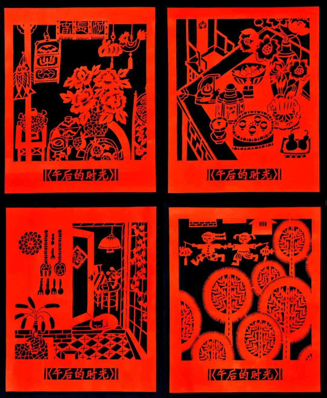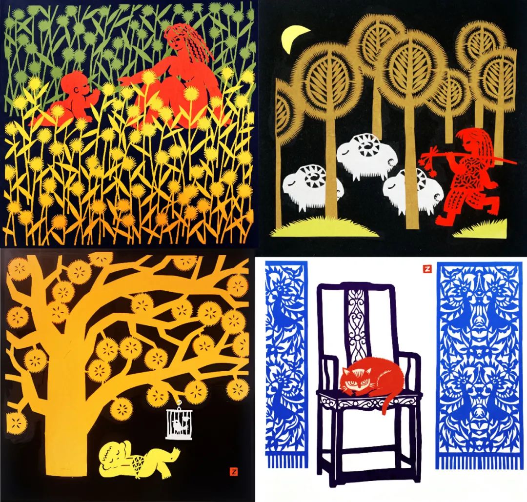 以拼貼套色技法重構剪紙視覺語法,實現其藝術獨立性:剪紙從裝飾躍升為承載哲思的觀念媒介。在風格成熟期突破了三重邊界:形式邊界,融合文學詩性與裝飾美學;功能邊界,從民俗工藝轉向美術館收藏、美術教材案例;文化邊界,將潮汕地域符號轉化為普世情感表達。