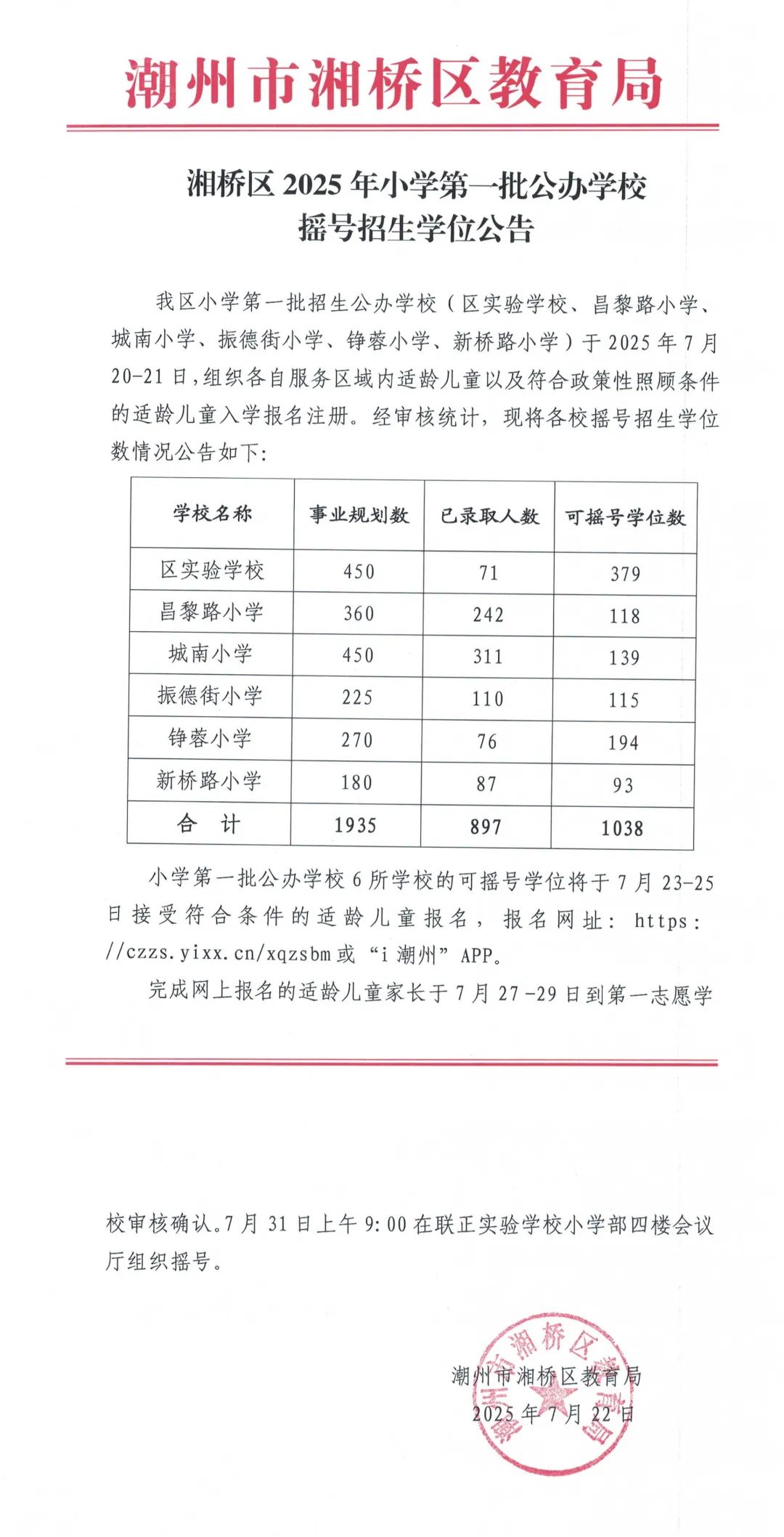 湘橋區2025年小學第一批公辦學校搖號招生學位公告