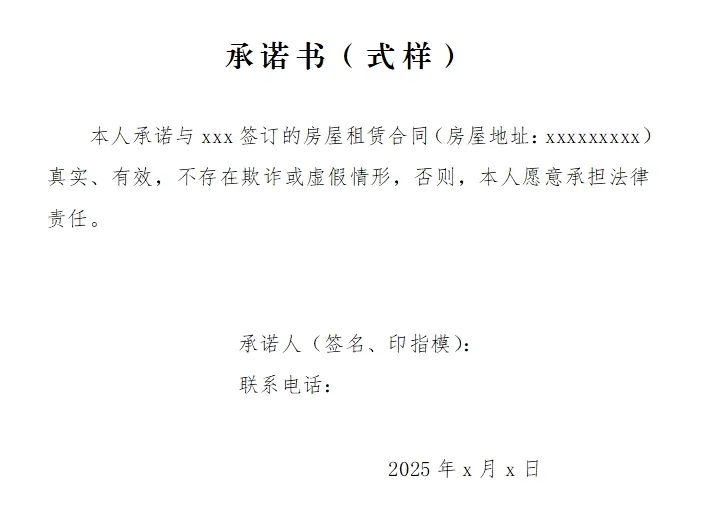 1.所有材料必須提交原件及復印件1份。 2.原件查驗退回,復印件1份(統一用A4紙復印)上交填報第一志愿學校。 3.家長可選擇提供以下7類住所證明材料中的任意一類:①《房屋所有權證》;②合法購房合同及有效交款憑證;③法律見證或公證處公證的房產;④房屋租賃管理部門鑒證的《房屋租賃合同》;⑤法律見證的《購房合同》或《房屋租賃合同》;⑥村委會(居委會)證實的《購房合同》或《房屋租賃合同》;⑦出租雙方簽訂的《房屋租賃合同》、供水部門或供電部門開具的該出租房屋的繳費票據、出租雙方的身份證、雙方出具的《承諾書》。 4.房屋租賃《承諾書》式樣見“附件2”。 |