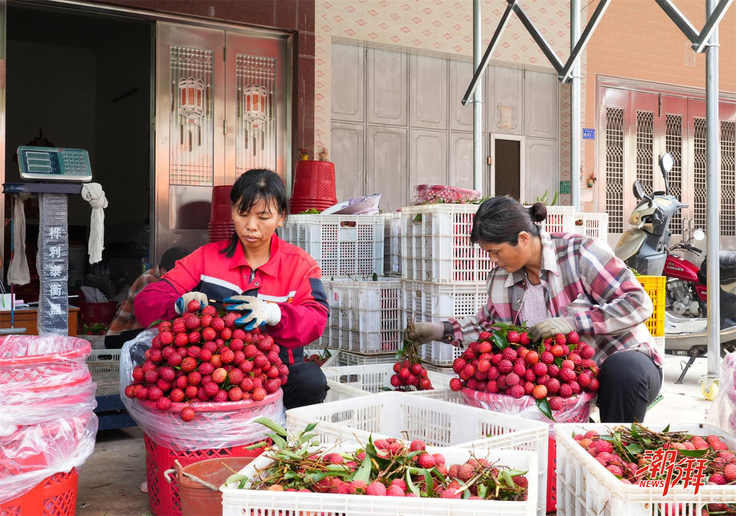 挑選、上秤、裝車(chē)……一筐筐滾圓飽滿(mǎn)的“大將軍”荔枝整齊碼放,農(nóng)戶(hù)陸續(xù)載著剛從枝頭摘下的鮮果趕來(lái),工作人員忙碌地分揀、稱(chēng)重、裝筐。