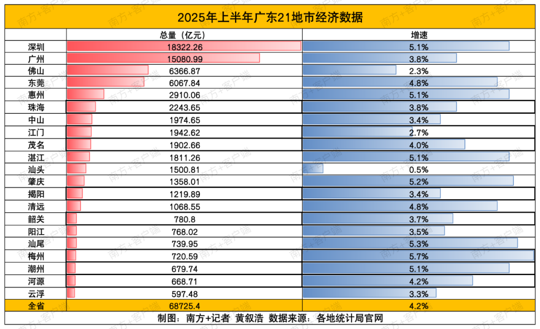 三是無論是總量還是增速,地市間的分化仍突出:總量排名第五的惠州與上一位的東莞相差超3000億元,“梯度”有待加強(qiáng);增速“墊底”的汕頭增速為0.5%,與一季度持平。