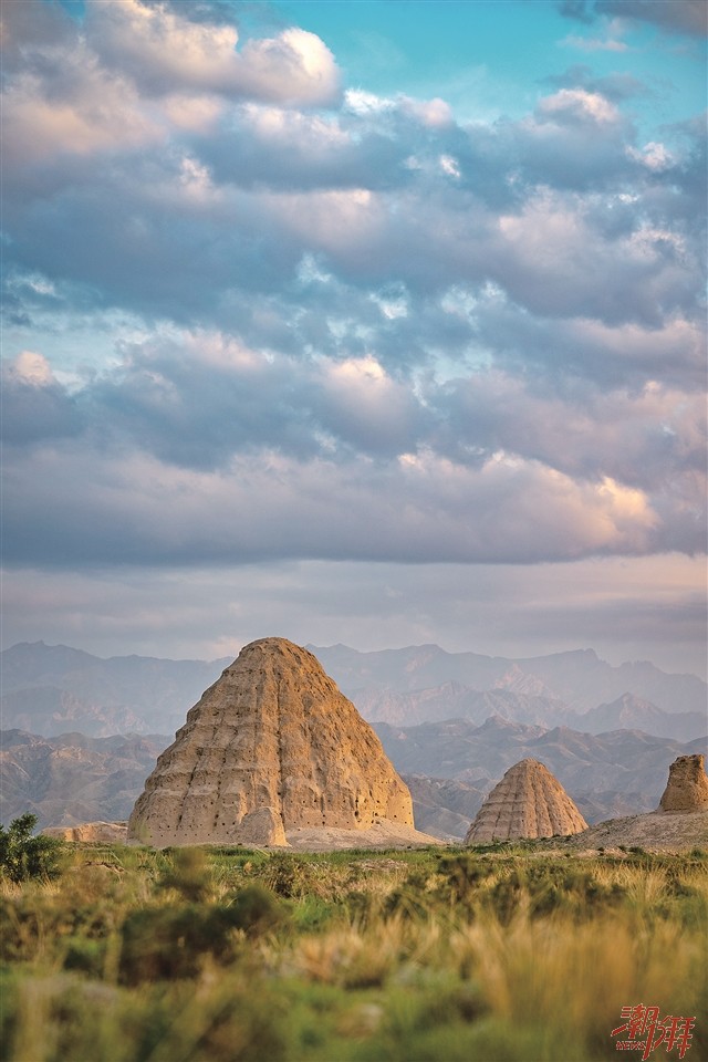 一座座“圓錐形的高大土堆”陵臺是西夏王陵的標志,遠望是赤裸的大山堆。歲月漫漶,風雨剝蝕,大土堆巍然屹立,顯出其千年的堅固。