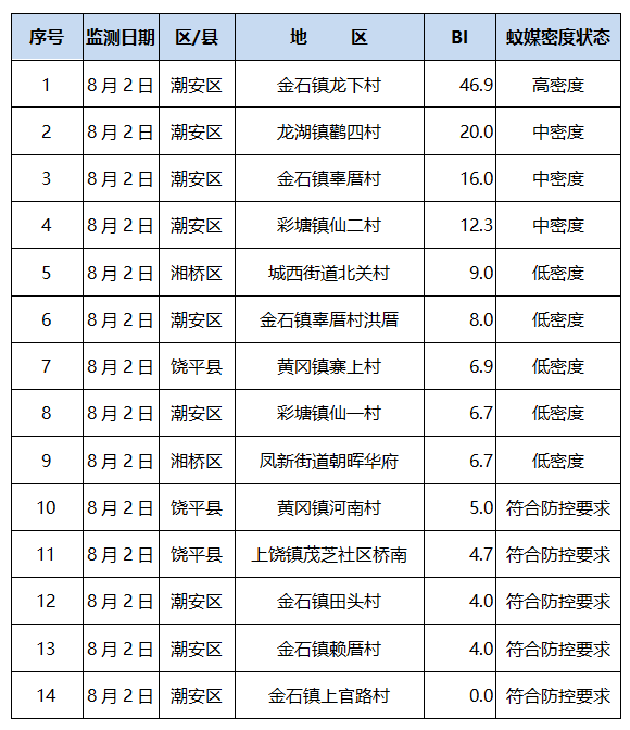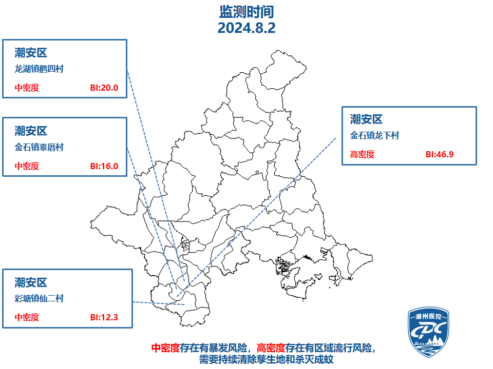 監測點病媒傳播風險較高的有:潮安區金石鎮龍下村、潮安區龍湖鎮鸛四村、潮安區金石鎮辜厝村、潮安區彩塘鎮仙二村。