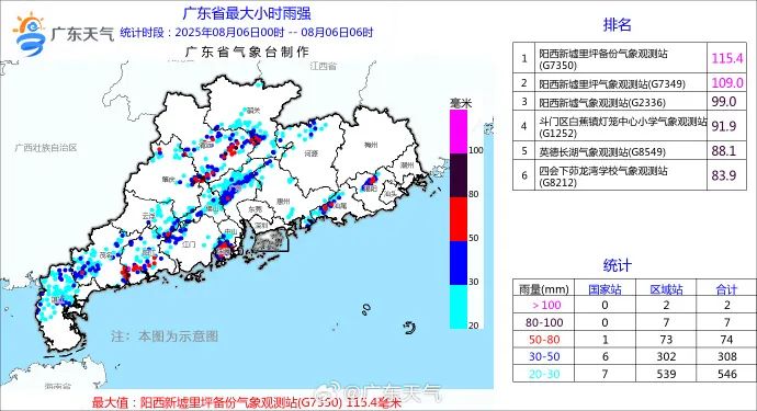 據氣象監測,8月4日20時到5日20時(過去24小時),廣東全省有28個鎮街錄得特大暴雨,有414個鎮街錄得大暴雨。最大雨量前幾名為:惠州海面小星山島470.6毫米、深圳大鵬新區南澳辦385.8毫米、汕尾城區馬宮街道350.9毫米、廣州從化區呂田鎮318.9毫米。