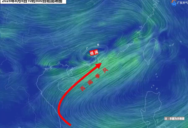而水汽條件來自季風。目前,強盛的西南季風攜帶著海上的大量暖濕氣流進入廣東,各地水汽充沛。