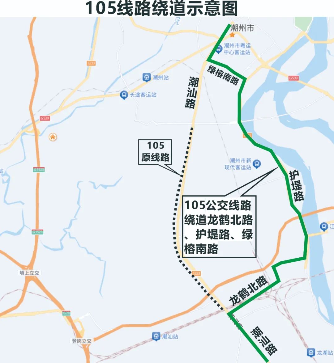 近段時間以來,受潮汕公路部分路段新增施工作業影響,道路通行性條件較差,同時結合105路部分班次自2025年5月份恢復原路線(途經潮汕路)運營的實際情況。為確保安全生產,自2025年8月7日起,105公交線路繞道“龍鸛北路—護堤路—綠榕南路”回到原線路,敬請有搭乘需求的乘客就近選擇其他站點上下車!線路恢復時間視道路管制情況而定,潮州粵運屆時將及時通過微信公眾號進行通知,請廣大市民提前做好出行規劃。同時關注“潮州粵運”微信公眾號,查看實時公交了解車輛實時到站信息,或撥打咨詢電話:0768-6874288進行咨詢。不便之處,敬請諒解。