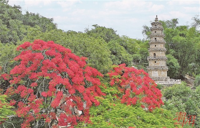 柘林鎮(zhèn)風(fēng)吹嶺綠美點(diǎn)古塔巍然,紅花簇簇。