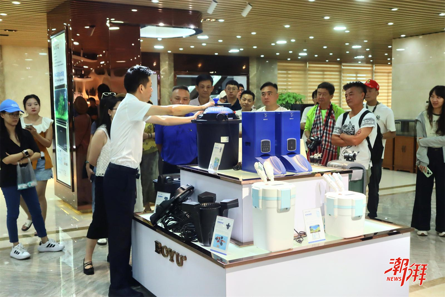 大V們參觀廣東博宇集團,展廳里負責人在介紹智能水族箱、寵物智能用品等成果。