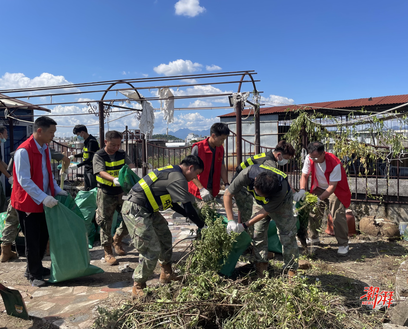 西新街道民兵應(yīng)急分隊(duì)在居民樓頂天臺(tái)清理雜草雜物。 吳育杭 攝