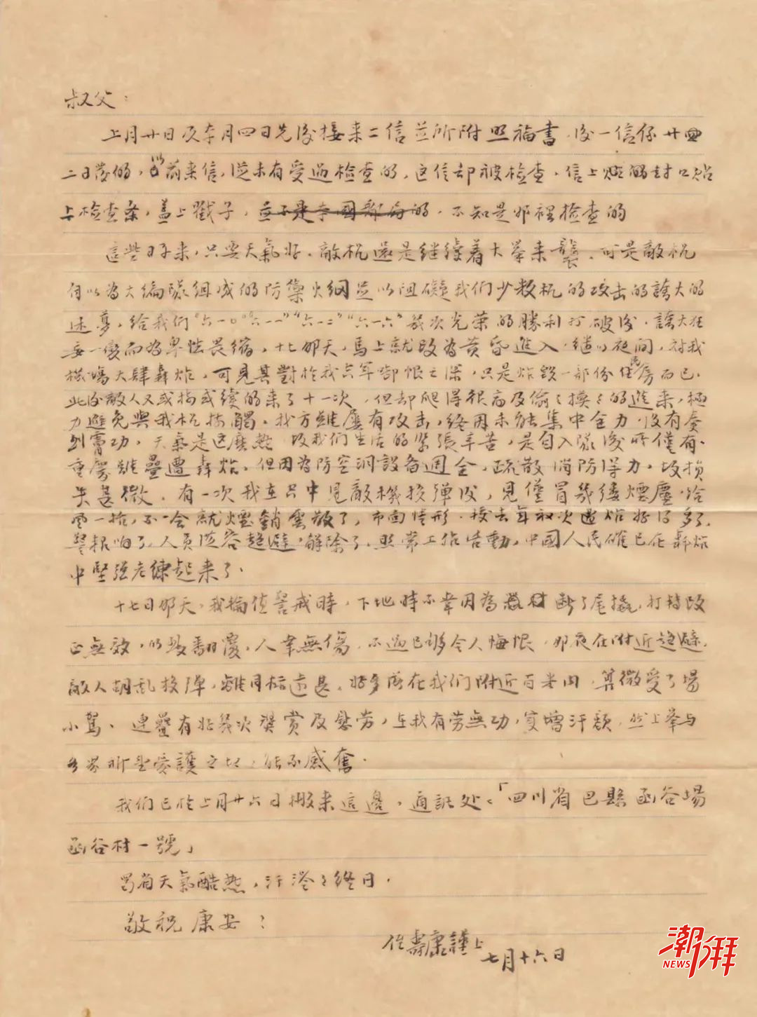 “當此國族存亡絕續之秋,個人生死早已置之度外,更何遑計及其他一切……”戰斗結束后,丁壽康的隊友們回到宿舍,意外發現了一封墨跡未干的家書,這是“飛將軍”丁壽康在犧牲前不足24小時寫給叔父丁季平的信。
