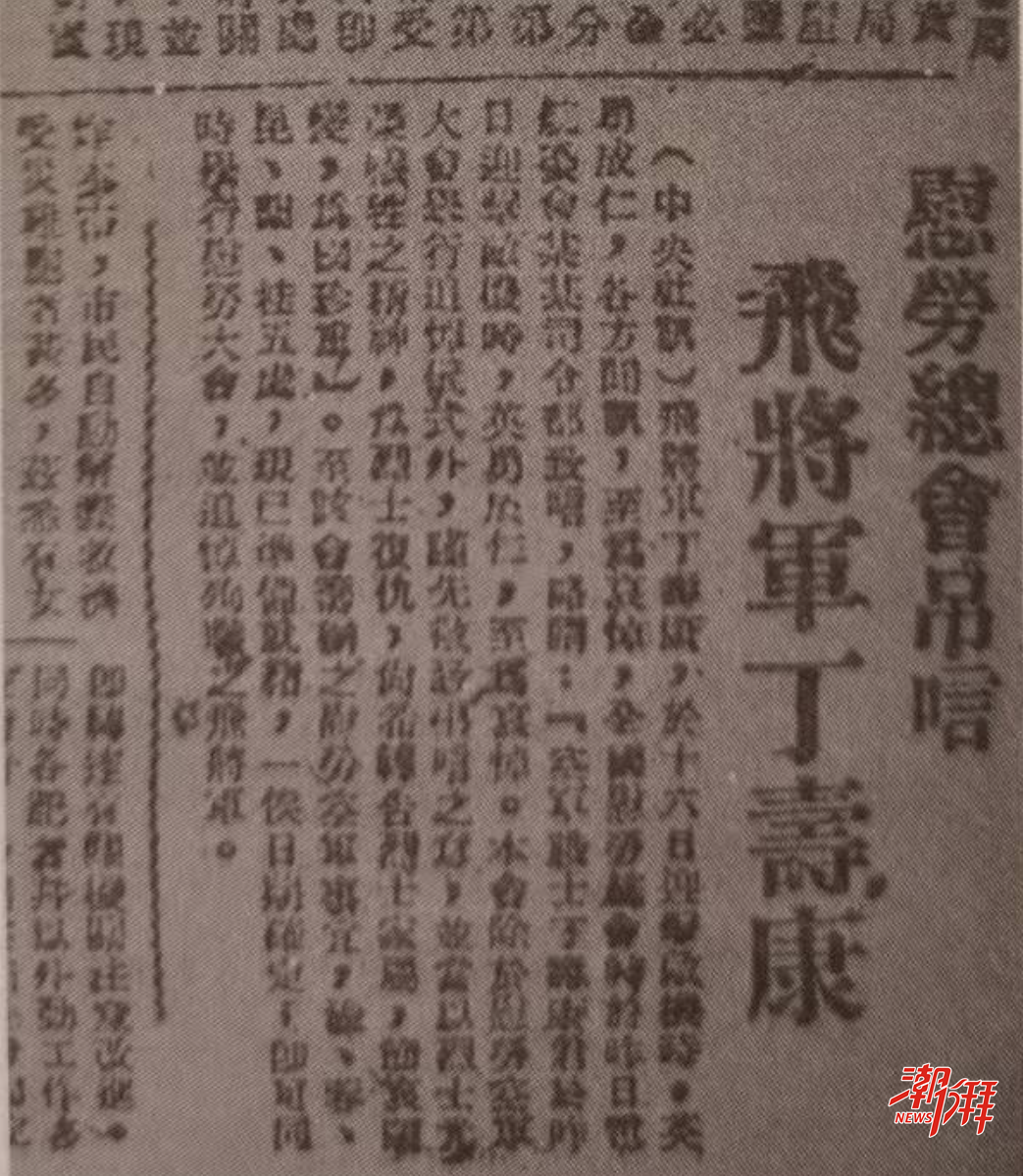 1940年7月18日《新華日報》關于全國慰勞總會悼念丁壽康的報道。