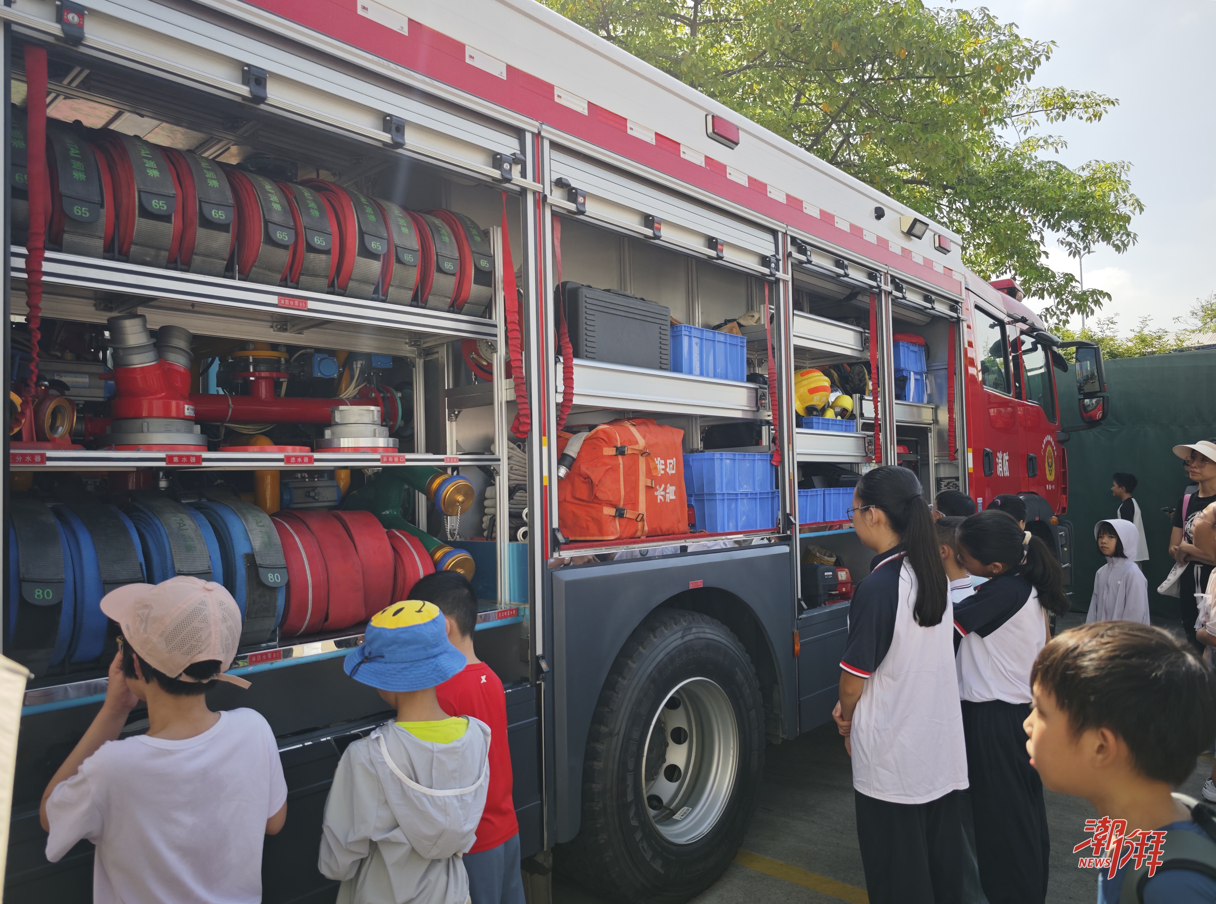 活動現場,孩子們在消防員引導下,逐一認識各類消防器材的功能與使用方法。孩子們還穿上厚重的消防服,登上高大的消防車,親手觸摸高壓水槍、破拆工具等專業救援裝備。消防員還現場演示消防排煙機器人和舉高噴射消防車的實戰應用,以及日常訓練中的速降、爬繩等科目。