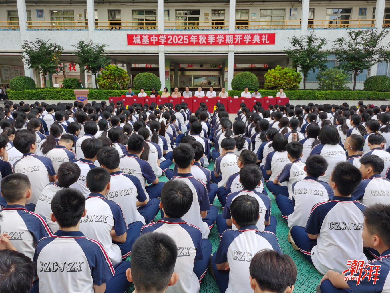 同一時間,湘橋區城基中學的操場上,五星紅旗迎著朝陽升起。當激昂的國歌響徹校園時,全體師生肅立注目,高年級學生抬手敬禮時,袖口的紅領巾格外鮮艷。升旗儀式后,全體教師舉起右拳,重溫入職誓詞:“為黨育人、為國育才……”鏗鏘的誓言回蕩在操場,老師們的眼神堅定,盡顯育人擔當。
