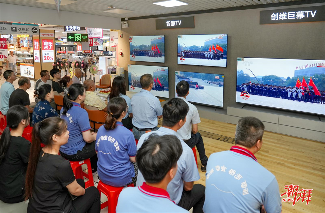 超市員工和顧客在家電銷售區觀看閱兵式直播。潮州日報全媒體記者 黃春生 攝