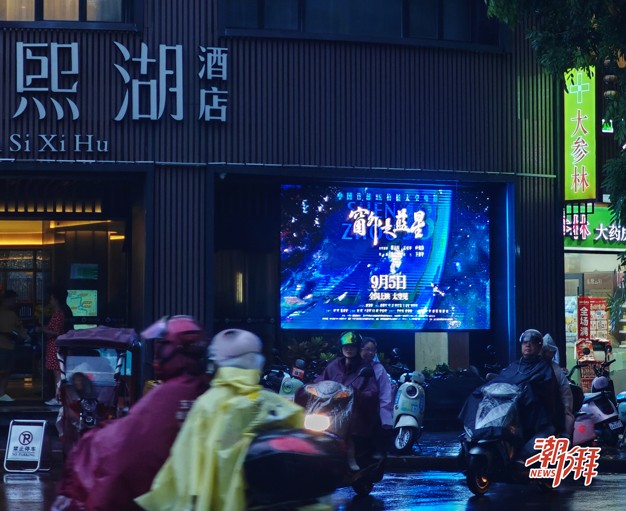 潮州古城韓思·.熙湖門口電子屏上播放著電影《窗外是藍星》的宣傳畫。(潮州日報全媒體記者 莊園 攝)