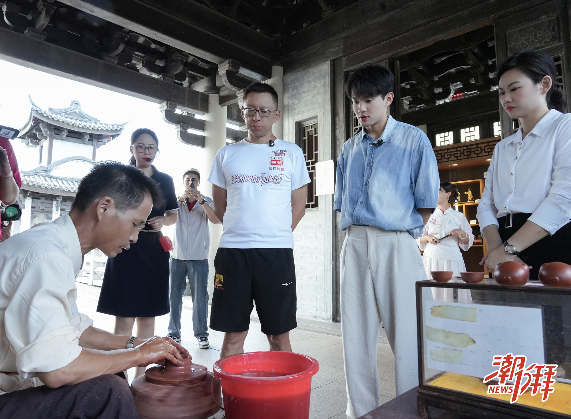 在廣濟橋,張朝陽被幾位潮州非遺代表性傳承人的精湛技藝深深折服。潮州手拉壺制作技藝代表性傳承人林潮明指尖靈動,賦予泥土生命;潮州剪紙非遺代表性傳承人黃朝陽以紙為媒、剪刀為筆,作品栩栩如生;潮州工夫茶藝市級代表性傳承人王翠瑩行云流水般的泡茶動作,盡顯潮州工夫茶文化精髓;潮州木雕市級非遺代表性傳承人盧進文經過精心雕琢,將木材化為精美的藝術品……張朝陽不時與傳承人交流互動,對他們的匠心精神贊嘆不已。
