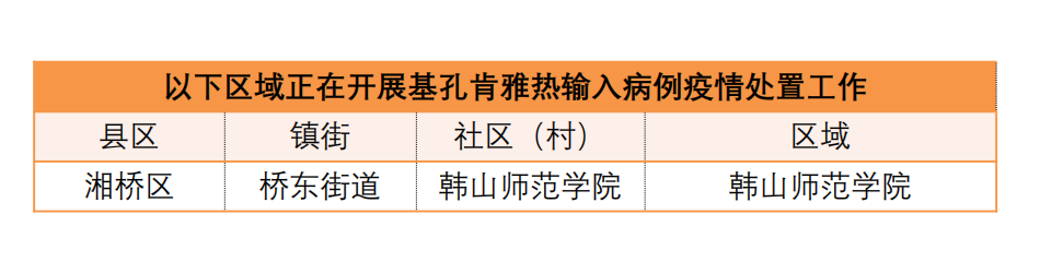 請在上述區域生活、工作或活動的市民朋友們注意做好個人防蚊滅蚊措施,積極清理積水,一旦出現發熱等基孔肯雅熱、登革熱相關癥狀要及時就醫,并配合完成基孔肯雅熱、登革熱檢測。