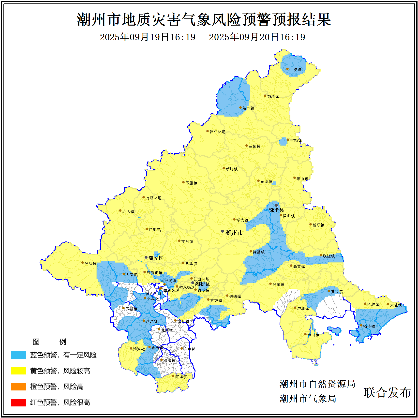 【潮州地質災害氣象風險預警】2025年09月19日16時預警消息,預計未來24小時,湘橋區:鳳新街道、橋東街道、官塘鎮、鐵鋪鎮、城西街道、磷溪鎮、紅山林場、太平街道、意溪鎮,饒平縣:所城鎮、新圩鎮、黃岡鎮、浮山鎮、錢東鎮、韓江林場、高堂鎮、新塘鎮、大埕鎮、東山鎮、浮濱鎮、三饒鎮、建饒鎮、海山鎮、樟溪鎮、湯溪鎮、聯饒鎮、新豐鎮、上饒鎮、饒洋鎮、汫洲鎮,潮安區:沙溪鎮、歸湖鎮、赤鳳鎮、古巷鎮、庵埠鎮、鳳凰鎮、萬峰林場、文祠鎮、登塘鎮等地地質災害氣象風險等級達到3級(黃色)。潮安區:浮洋鎮、楓溪鎮、金石鎮、鳳塘鎮、彩塘鎮,湘橋區:西新街道,饒平縣:柘林鎮等地地質災害氣象風險等級達到4級(藍色)。