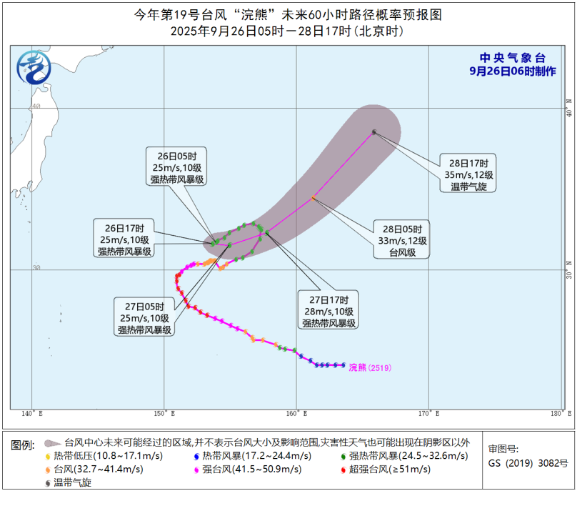今年第19號臺風(fēng)“浣熊”(強熱帶風(fēng)暴級)的中心今天(26日)早晨5點鐘位于日本東京東偏南方向約1380公里的西北太平洋洋面上,就是北緯31.8度、東經(jīng)153.9度,中心附近最大風(fēng)力有10級(25米/秒),中心最低氣壓為985百帕,七級風(fēng)圈半徑250-300公里。