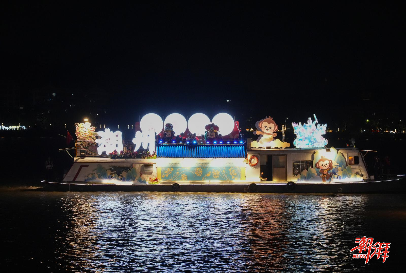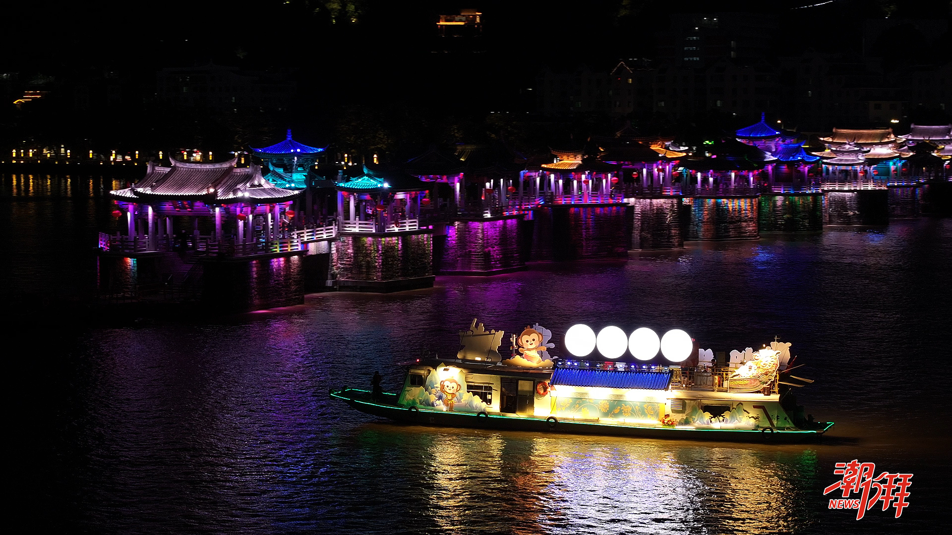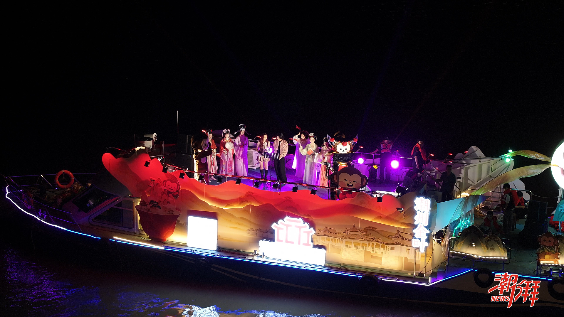 廣濟橋·“津梁啟泰”儀式落幕不久,韓江·“洄響季”巡游音樂會接棒登場。夜幕降臨,數艘精心定制的“府樓猴”和非遺主題的燈船格外醒目,在韓江西岸、廣濟橋周邊江面分散排開,與亮起燈光的廣濟橋、筆架山形成呼應,瞬間將現場帶入夢幻的“光影世界”。裝扮成“府樓猴”的演員與身著飄逸漢服的表演者、歌手在燈船上向岸上游客揮手互動,瞬間吸引了大家的目光。