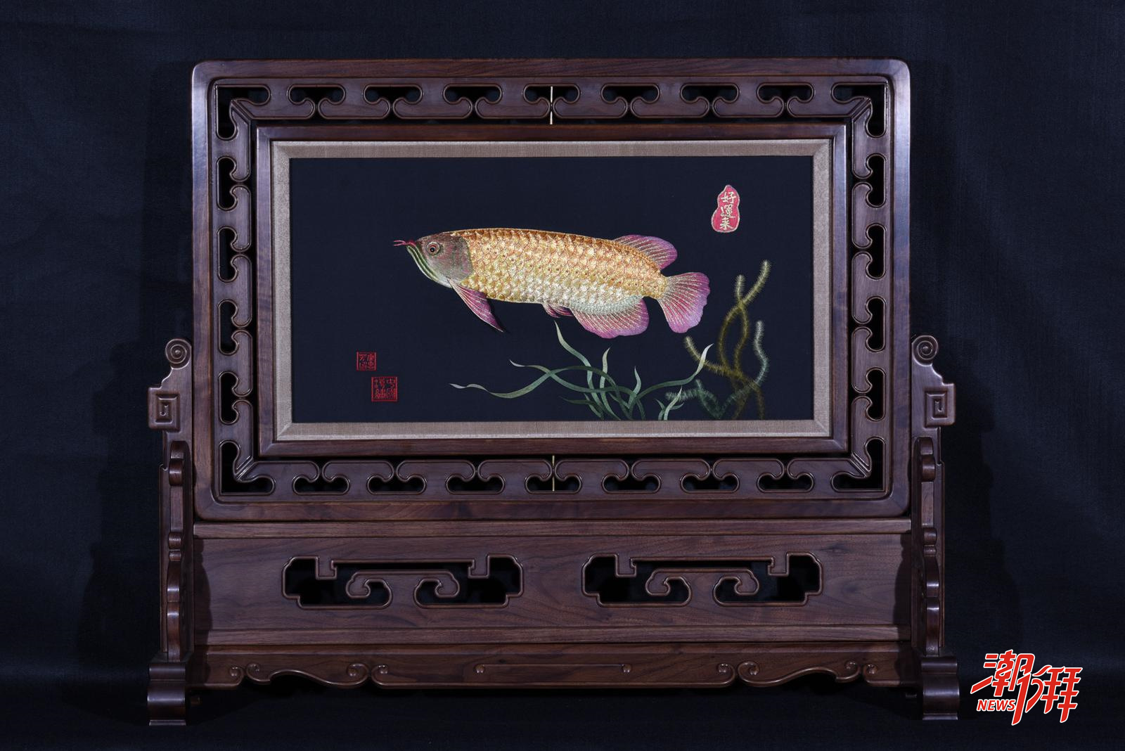 在匯聚了全國46件非遺精品的“華韻承芳·非遺共賞”女性主題特展現場,康惠芳的兩件潮繡龍鳳褂裙作品陳列于“女性之美”單元的核心位置,吸引了各國嘉賓的目光。作品采用潮繡獨有的金銀線盤金繡法精繡而成,裙身之上,龍騰鳳舞,紋樣繁復華麗,栩栩如生;立體墊高的刺繡技法,使得龍鳳鱗甲清晰、羽翼豐盈,在燈光下流光溢彩,盡顯東方古韻。另外,康惠芳參展的還有《金龍魚》潮繡作品,作品以飽滿的構圖、絢麗的色彩和獨特的立體墊高繡法,將金龍魚靈動矯健、鱗片閃耀的姿態刻畫得栩栩如生,精湛絕倫的工藝引得各國嘉賓駐足流連,紛紛贊嘆。